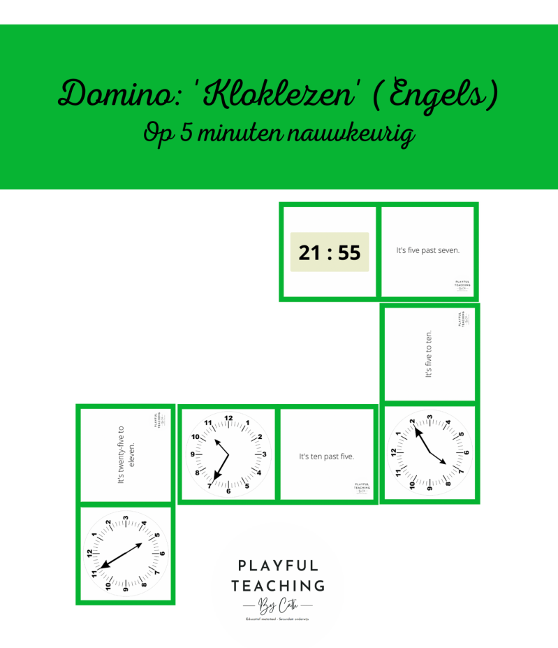 Met deze domino kunnen de leerlingen kloklezen in het Engels inoefenen. Bij dit spel wordt de focus gelegd op volle uren, halve uren en kwartieren. De domino bevat 24 kaartjes (12 kaartjes met de analoge klok en 12 kaartjes met de digitale klok).