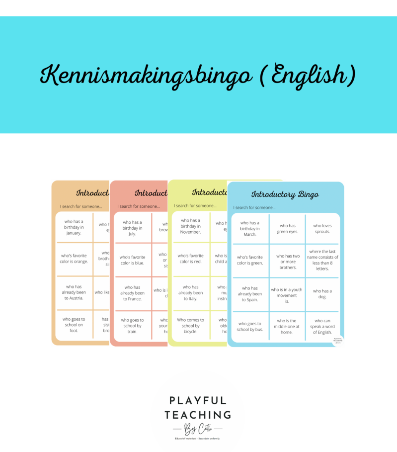 In dit bestand zitten er vier bingokaarten. Met deze bingokaarten kunnen de leerlingen elkaar beter leren kennen. Deze kaarten zijn in het Engels.